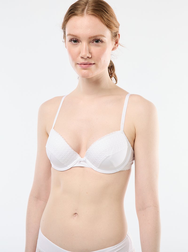 Een beugelbeha met kant en een flatterend model dat je boezem niet al te opvallend accentueert.