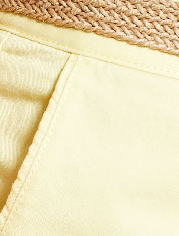 Een casual chique bermuda met ceintuur van gevlochten jute. Om opgerold te dragen voor een stijlvolle look.