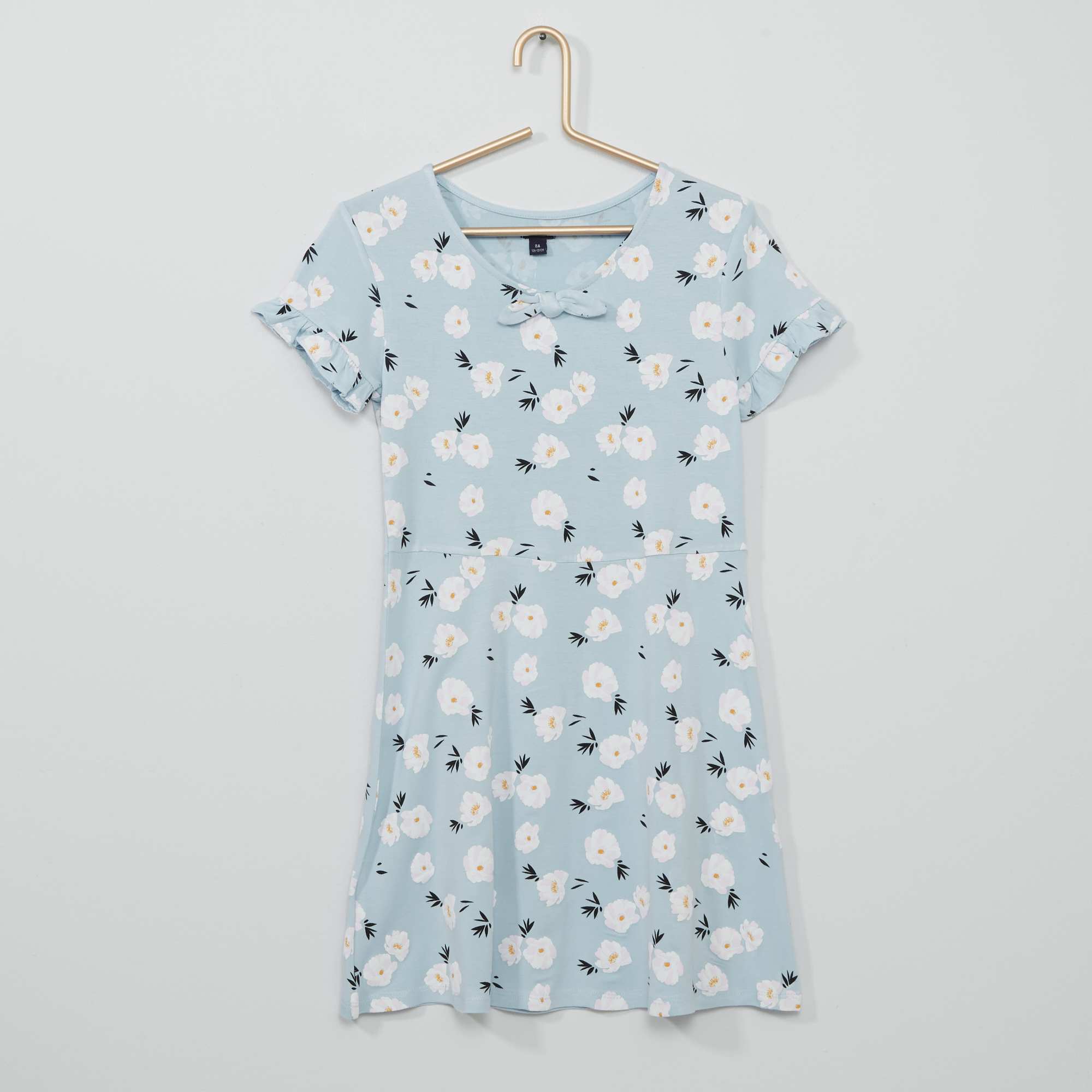 Een jurkje met bloemenprint en kleine volants aan de mouwen, voor een romantische stijl.