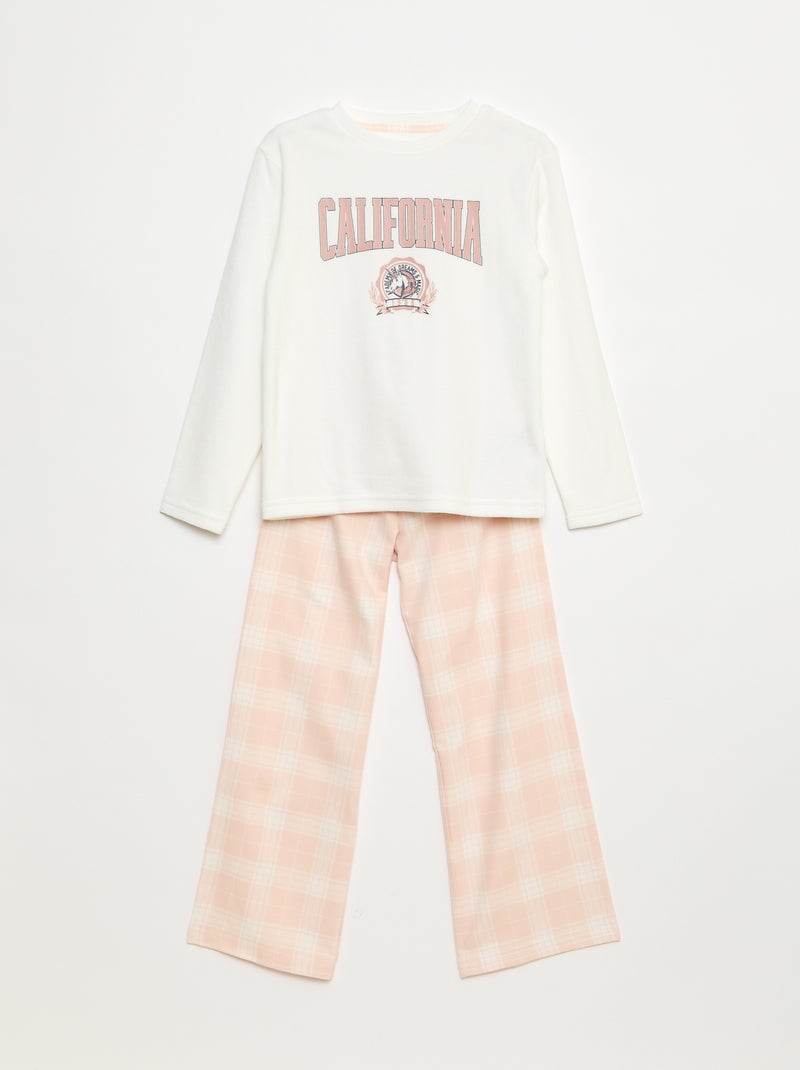 Lange pyjama van fleecestof - T-shirt + broek - 2-delig - Wit