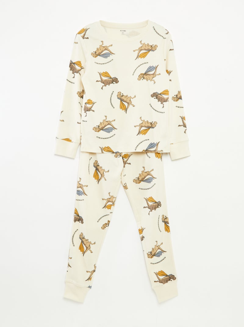 Lange pyjamaset T-shirt + broek met all-over motief - Biege