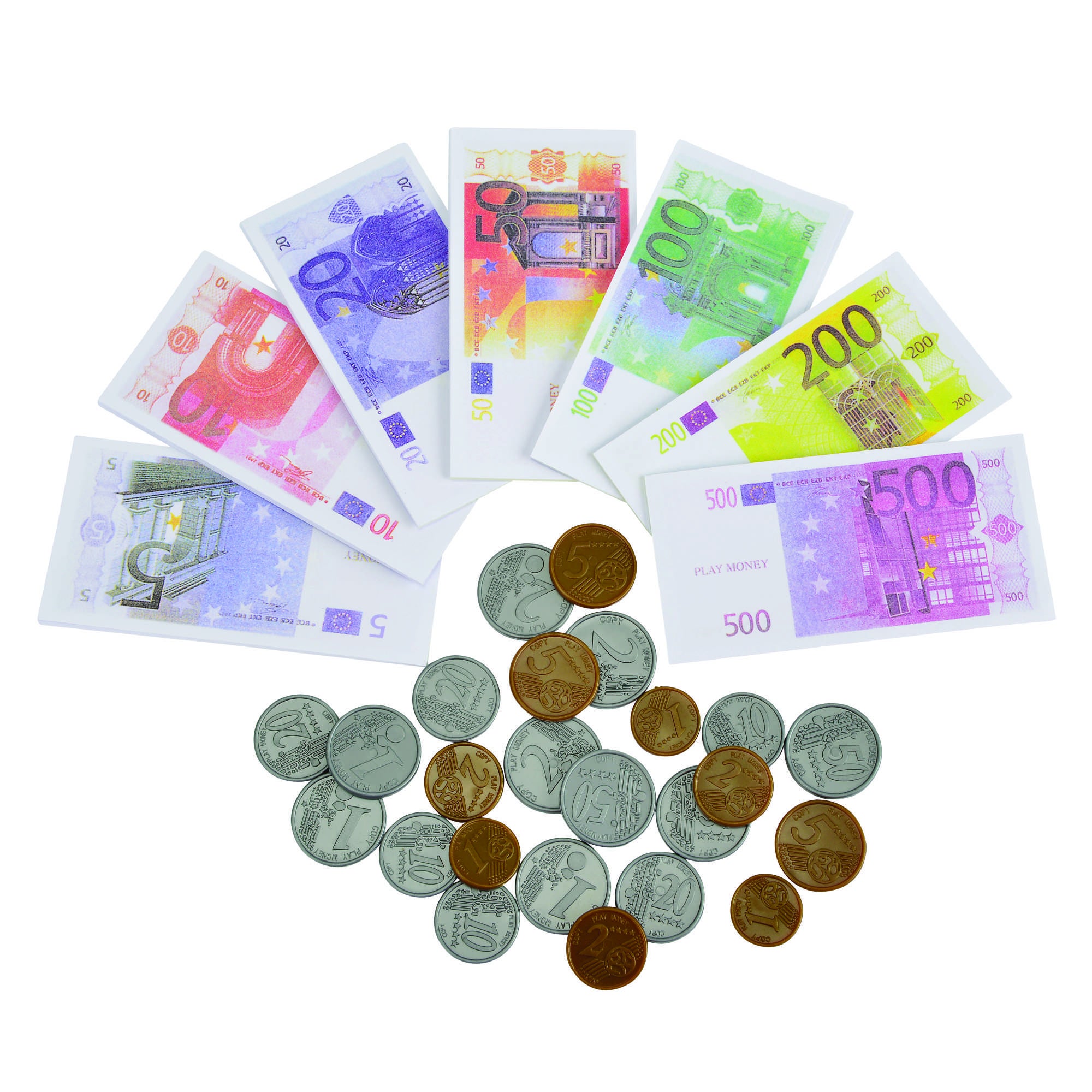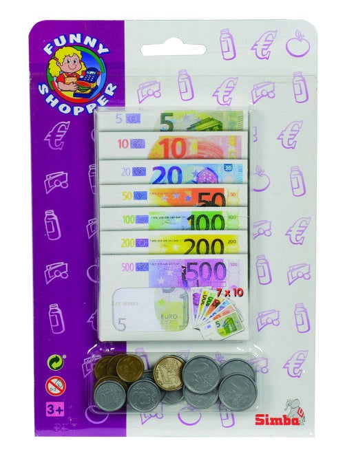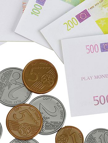 Onmisbaar om winkeltje te spelen: deze muntjes en briefgeld vullen kleine portemonneetjes en de kassa!