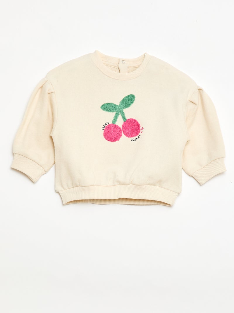 Een fruitige collectie voor een baby om op te eten! - Sweatshirt - Van ongeborstelde fleece - Ronde hals - Lange mouwen - Halve drukknoopsluiting achteraan van 3 tot 12 maanden - 'Kersen' patch van badstof op de voorkant - Afwerking met ribboorden - 100% katoen