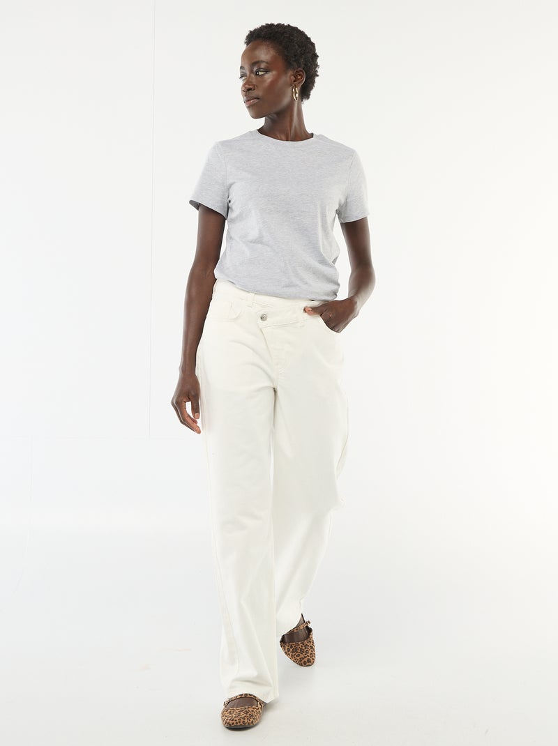 De twill broek met een asymmetrische opening voor een maximum aan stijl.