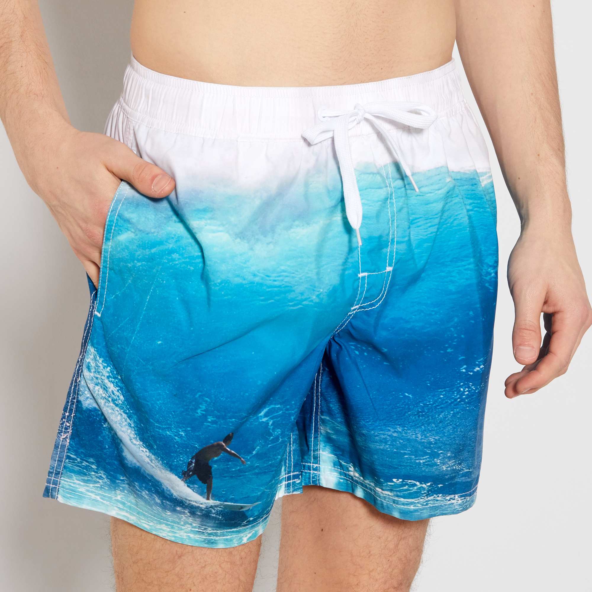 Met de fotoprint van deze short wil je alleen nog maar in de golven duiken en luieren op het strand!